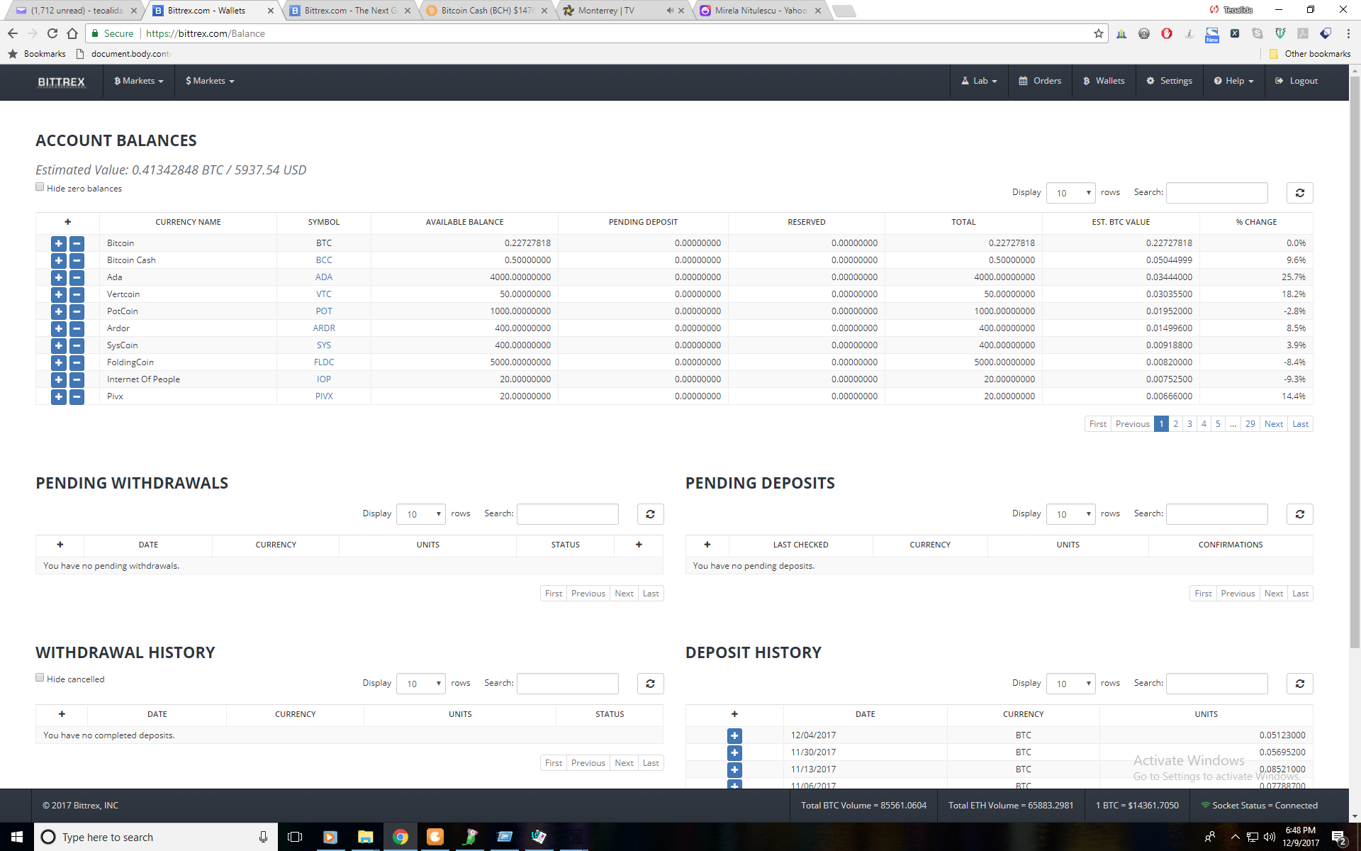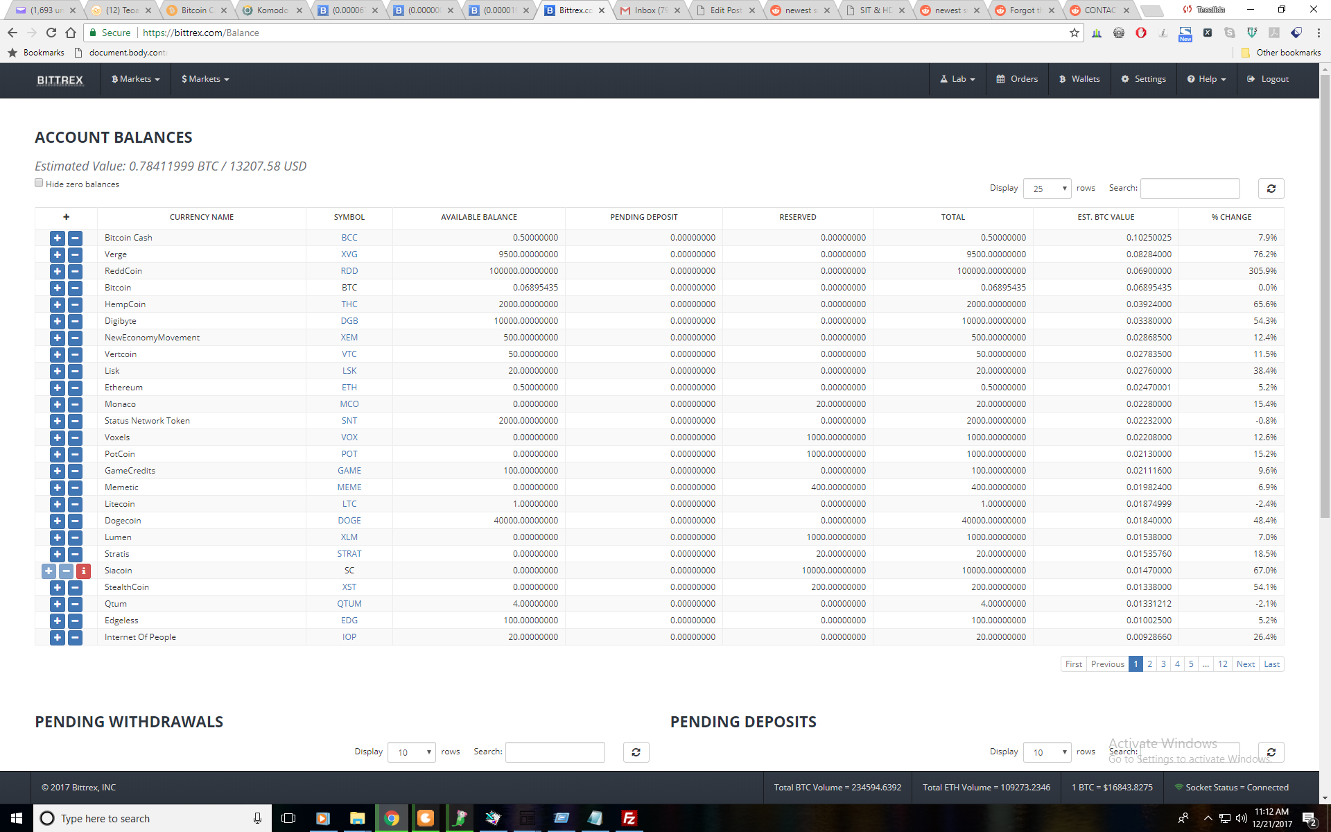 In December 2017 I made a lot of profits when total crypto marketshare doubled pushed heavily by South Koreans and Bitcoin dominance dropped to 33%, I put money in about 30 altcoins which some of them surged 10x in value compared with Bitcoin. The coins did not rose simultaneously, so the lucky guys who had Dash and sold it after rise and immediately buying Cardano and Ripple, could have made over 50x profits. Personally I bought Ripple and Cardano and sold them after initial surge without being aware that they will continue to surge again. I made most profit with Verge which was sleeping at 50-60 satoshi in early December, when I saw it rising on 16 December I bought $300 at 175 satoshi and by 24 December it reached peak 1900 satoshi, I sold half at 780 on 21th and half at 1330 satoshi on 25th, having profit 7x in one week, regretting for not buying more Verge. But not all coins I invested in rose in value, the profit made from Cardano, Ripple, Verge hardly coped the loss from other coins.