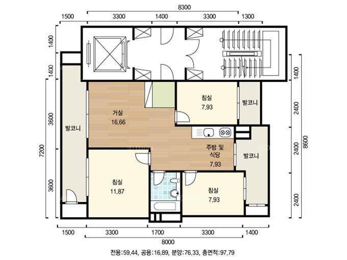 3-bedroom 2-bay, 84 sqm (18-21 m long) example, example 76 sqm