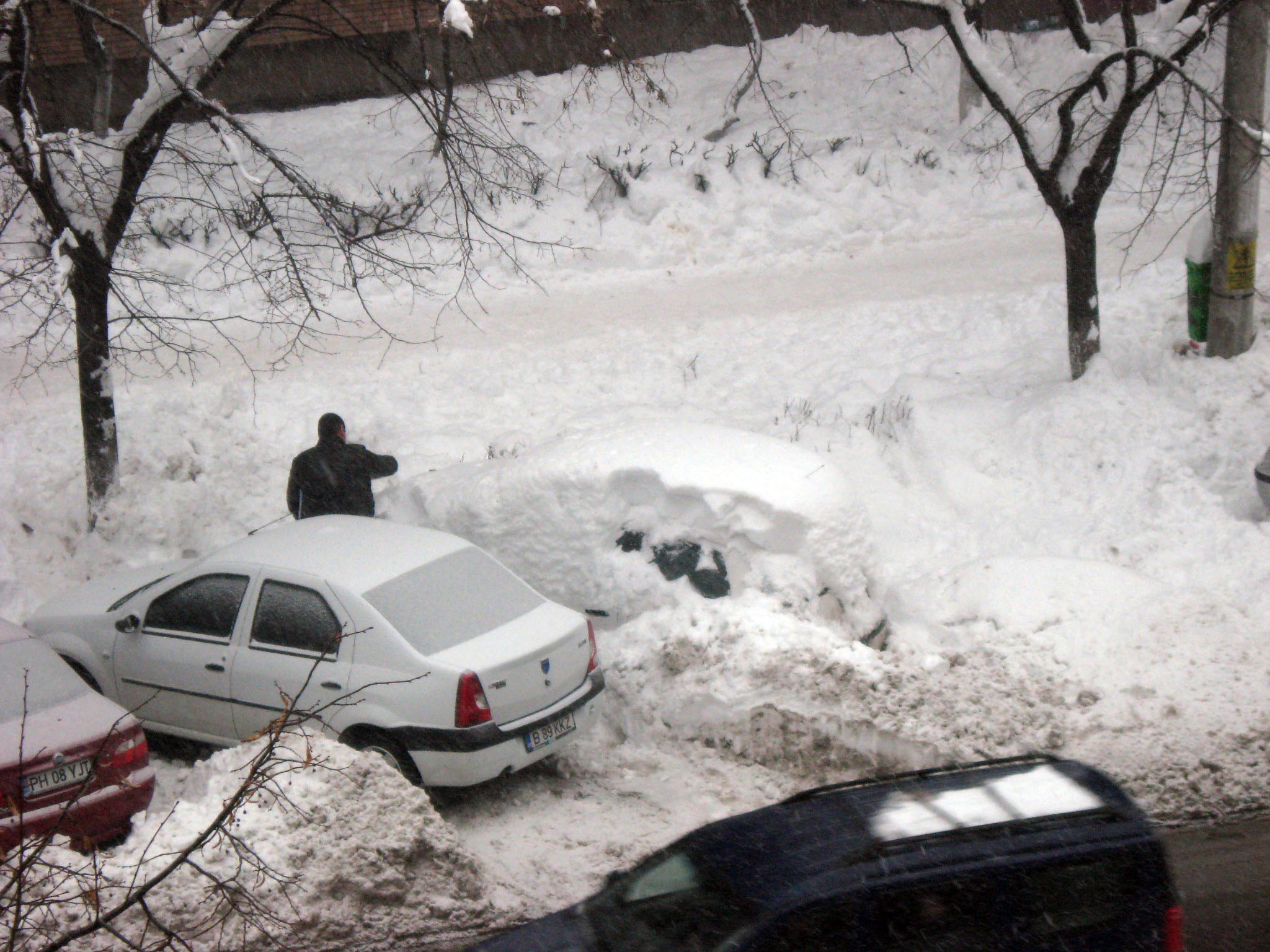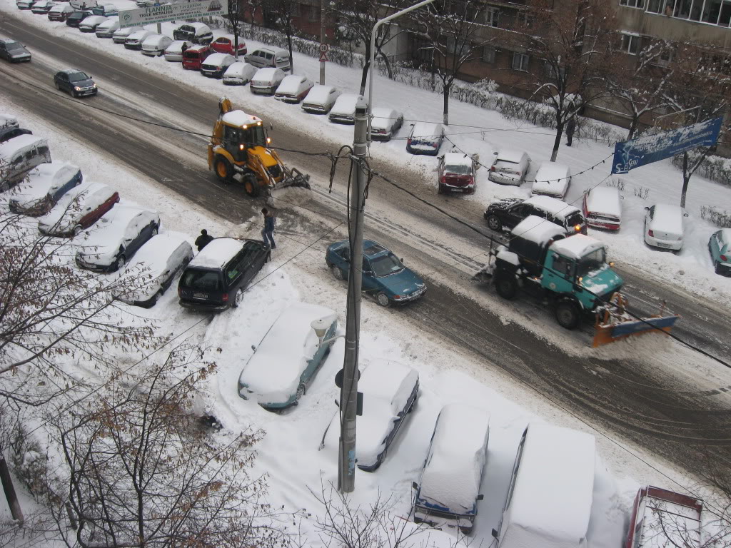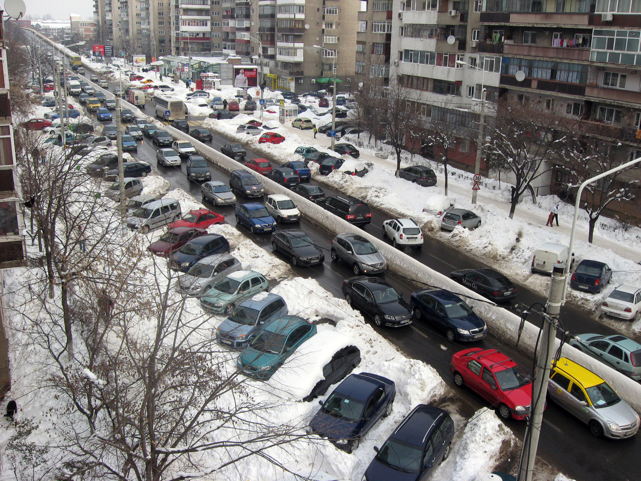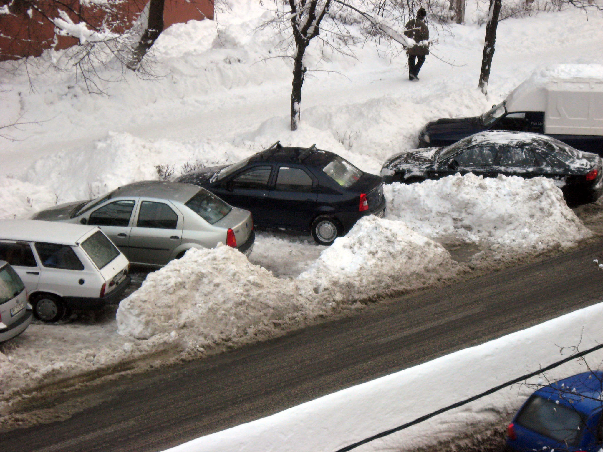 The blue car is actually parked, the black SUV is towing the red car, the black minivan is stucked with its floor on snow and waits to be towed, the 4-lane avenue became 2-lane