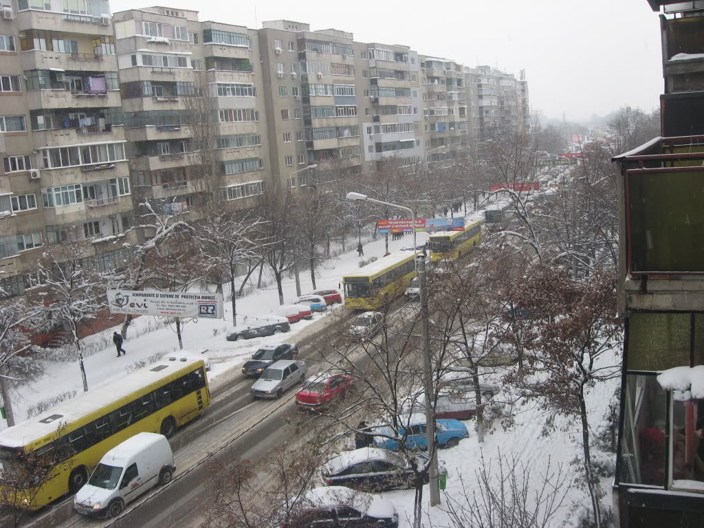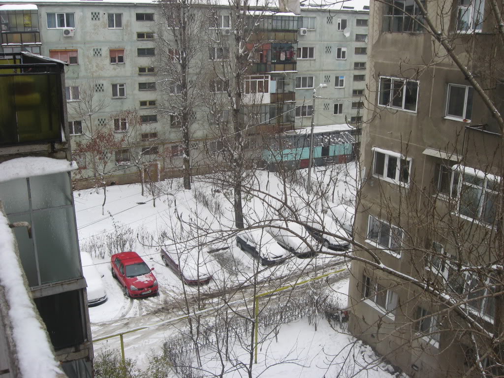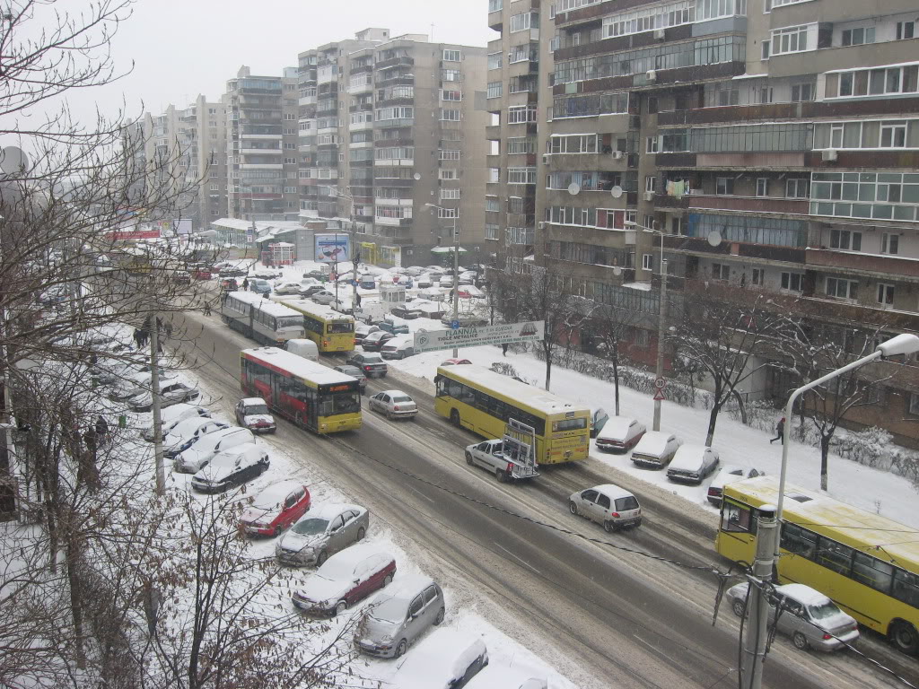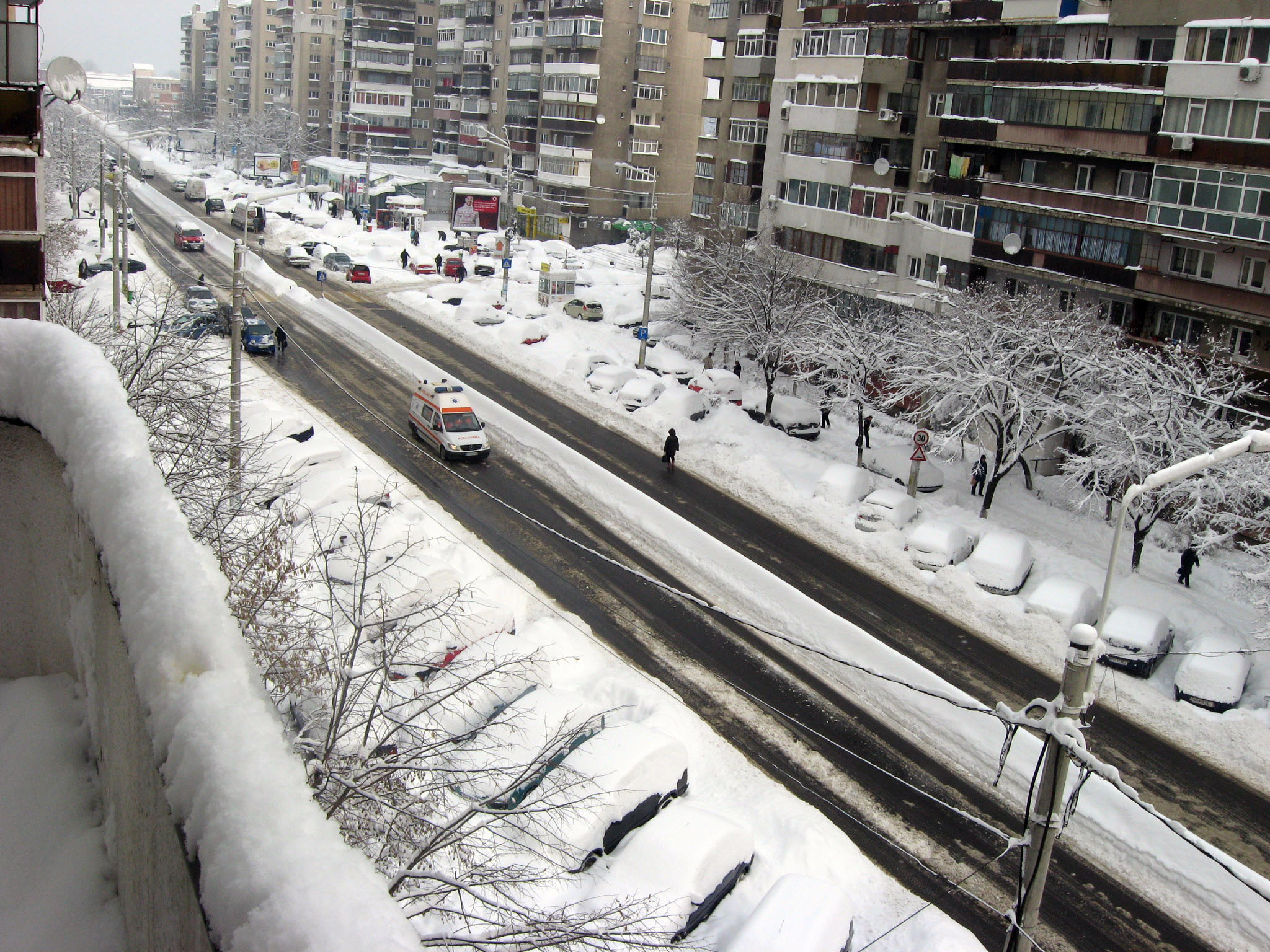 The blue car is actually parked, the black SUV is towing the red car, the black minivan is stucked with its floor on snow and waits to be towed, the 4-lane avenue became 2-lane